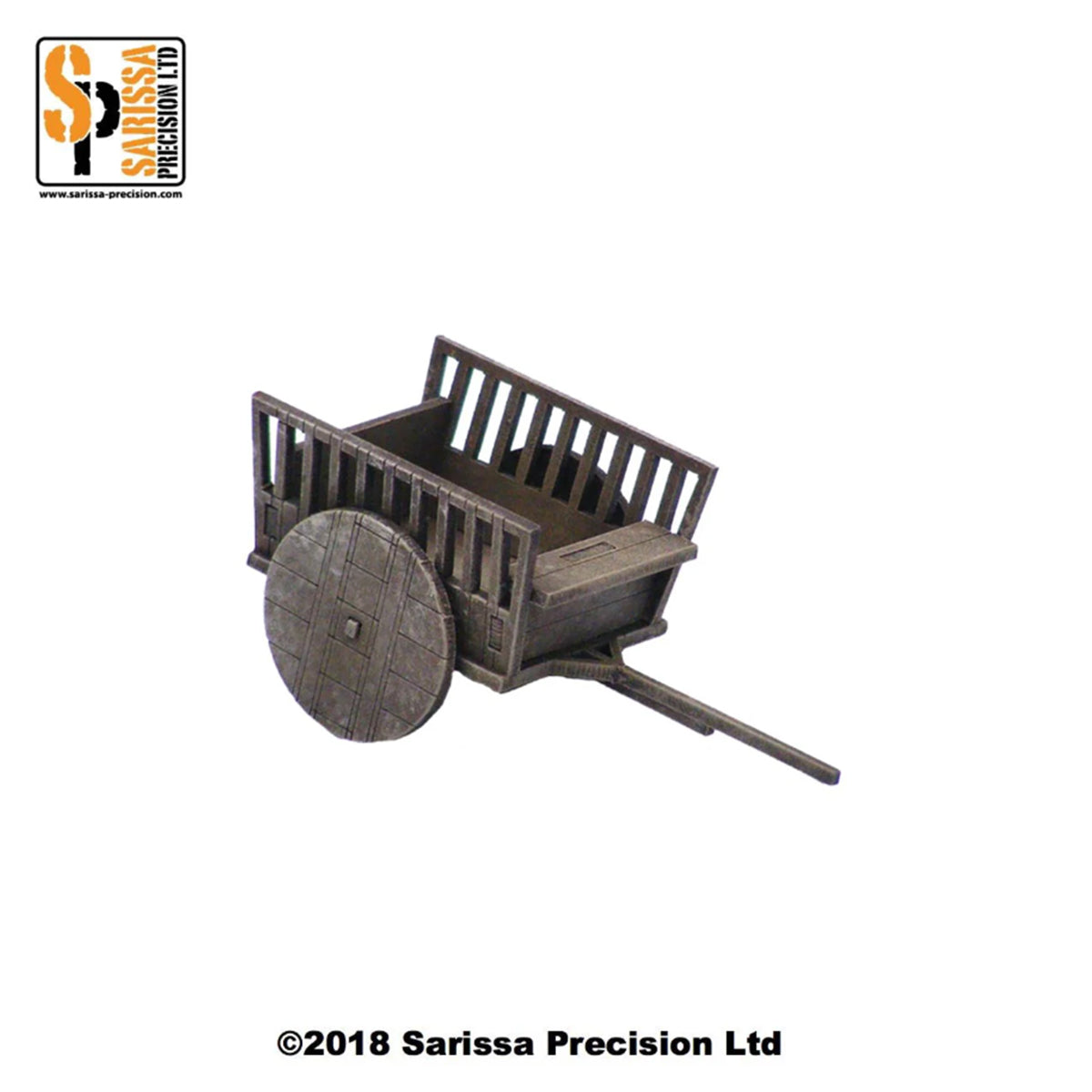 At the centre stands a traditional Saxon/Norman church, supported by timber-planked structures, a versatile A-frame hut, and two wattle fence sets—perfect for defining fields, livestock pens, or defensive chokepoints. The ox cart adds narrative flavour and scenario potential, from supply runs to ambushes.