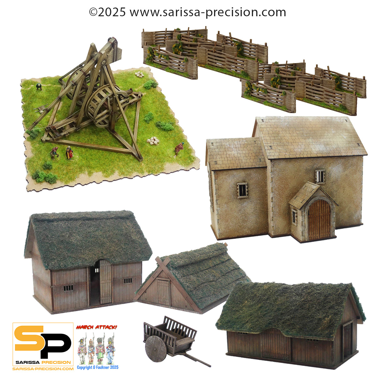 Step into the heart of medieval conflict with the Baron Land Terrain Set, a fully featured collection of MDF kits designed to enhance your games including The Barons' War, as well as a wide range of other historical and fantasy tabletop rulesets. This set captures the look and feel of a rural settlement under threat