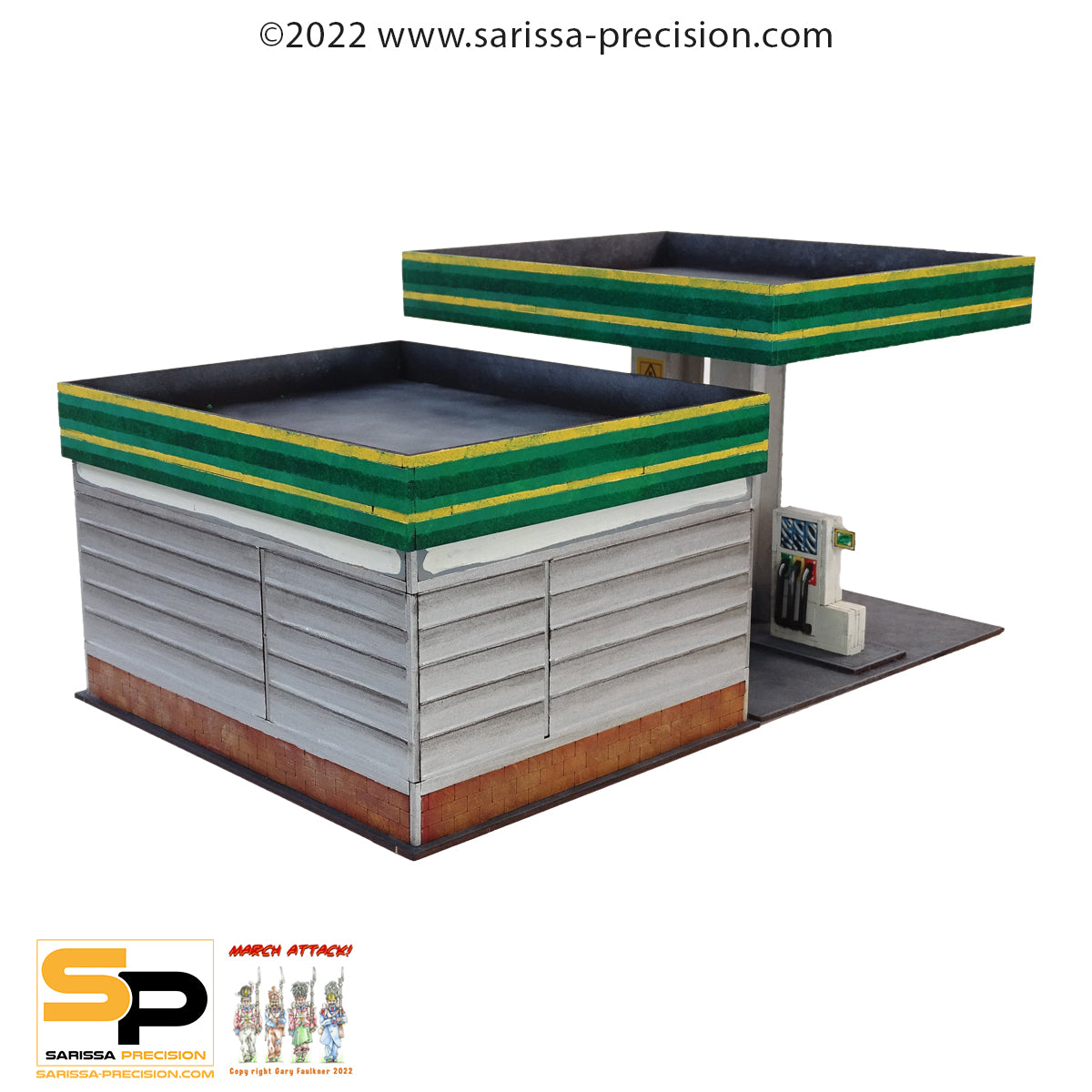 This Gas Station provides a modular set of shop and forecourt to position as required. A removable roof allows for a hold-up inside the station store.