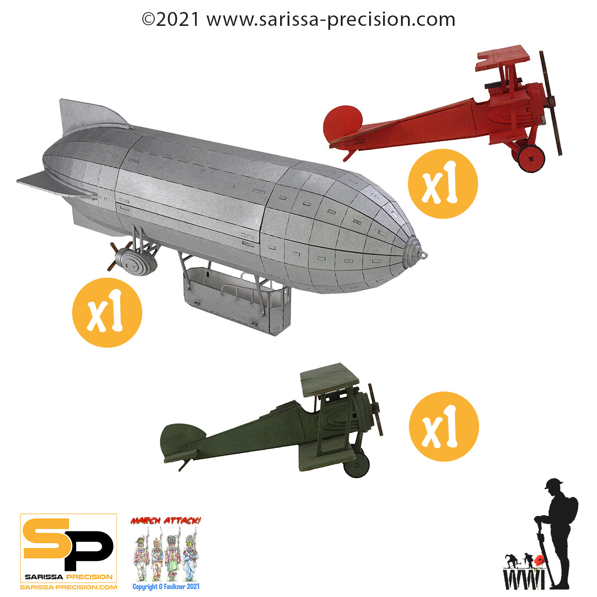Take the fight to the skies with this WWI Airship Battle Set. Includes the German Fokker Dr1 and German Airship Vs your choice of attacking Allied aircraft.