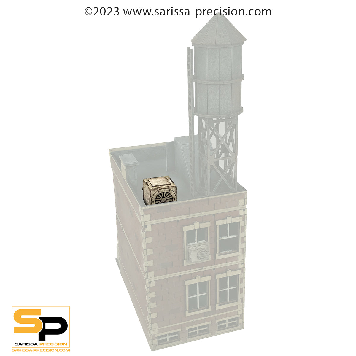 The City Block: Roof Air Con Units are a common sight on the late 20th-century city block skyline and are a great accessory, along with fire escapes and water towers, for your residential houses.