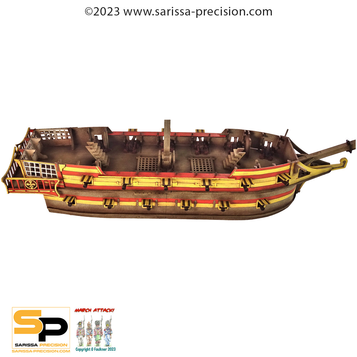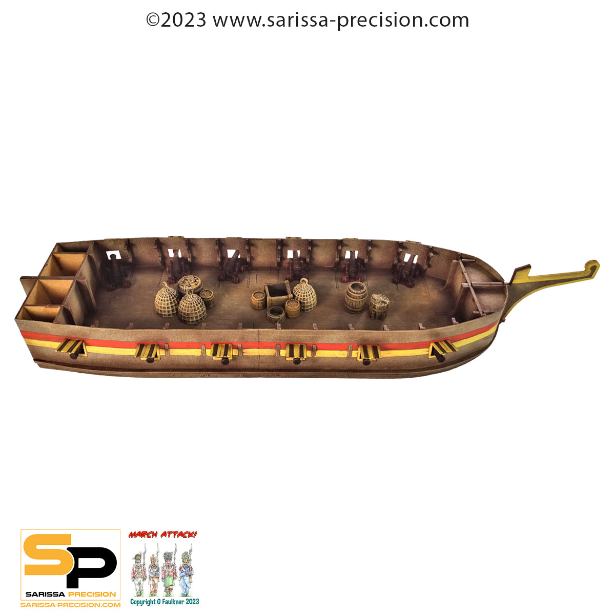 Fighting in a port or from deck to deck off-shore, this ship is ideal for the task. It comes with a removable quarterdeck and forecastle, allowing access to the main gun deck. You can also remove the top gun deck allowing access to the lower gun deck too.