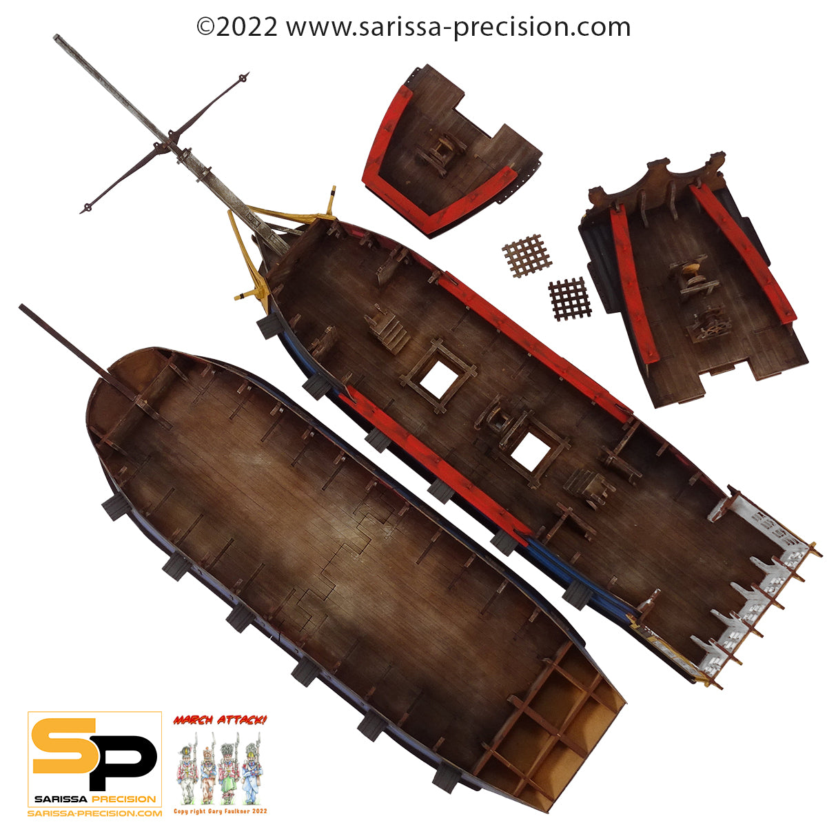 Fighting in a port or from deck to deck offshore, this ship is ideal for the task. It comes with a removable quarterdeck and forecastle allowing access to the main gun deck, you can also remove the top gun deck allowing access to the lower gun deck too.