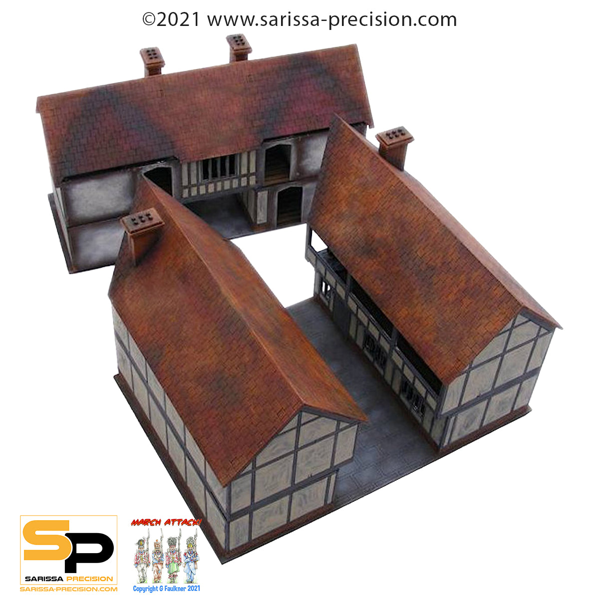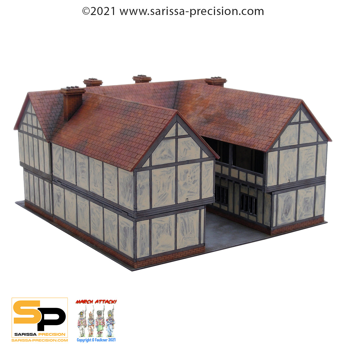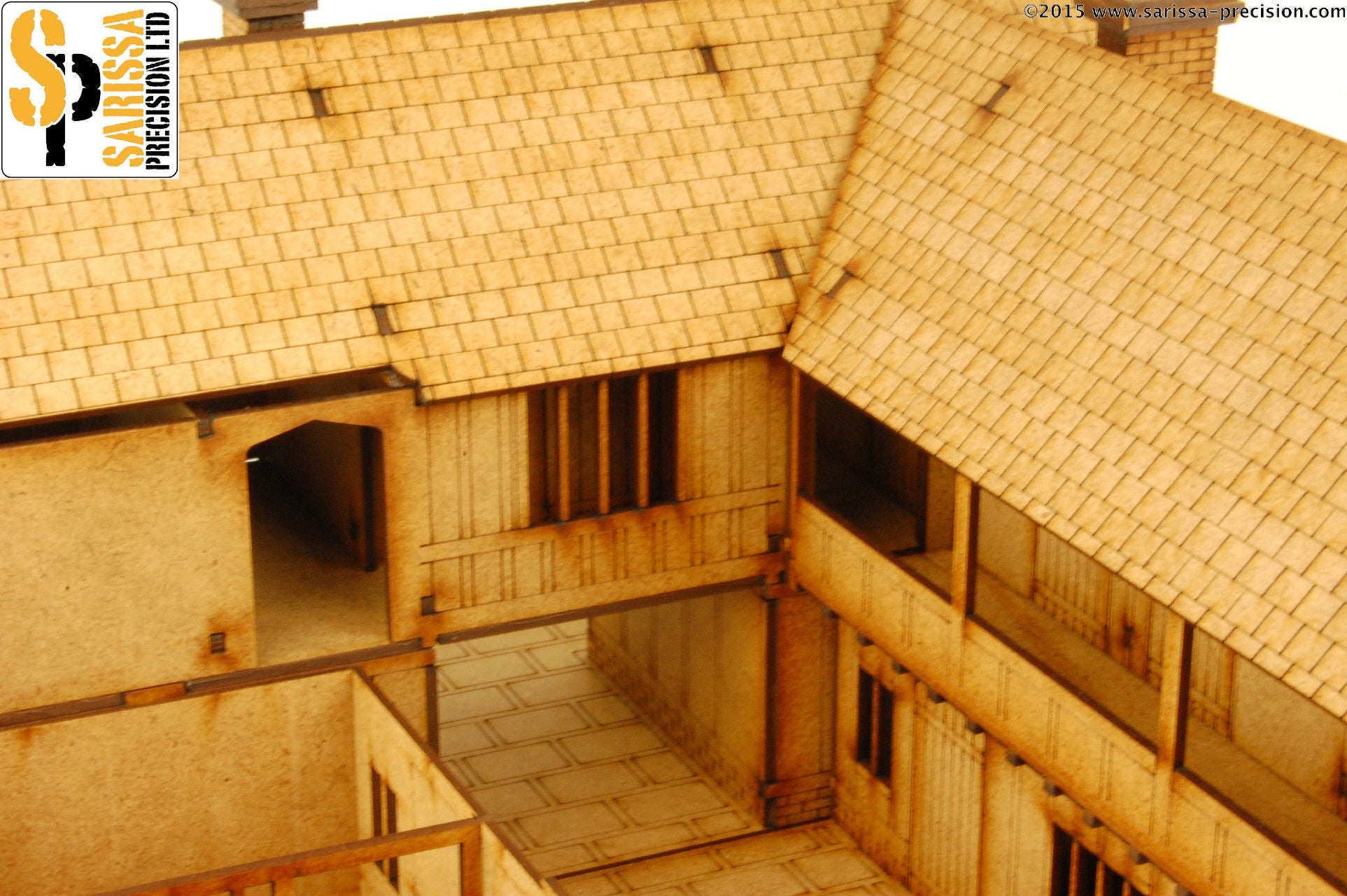 This impressive kit will serve as either a tavern or a coach house. Coach houses would be used to house coaches, hay and tack, with larger examples such as this also including basic living quarters for the staff who managed the horses and carriages. Whilst horses were also occasionally stabled in the coach house, they were but usually kept in a separate barn or stable. This kit may also be used as a tavern serving food and drink and offering lodgings to weary travellers. Supplied unassembled and unpainted in kit form with full instructions. Any models or accessories shown are for scale purposes only and are not included. |