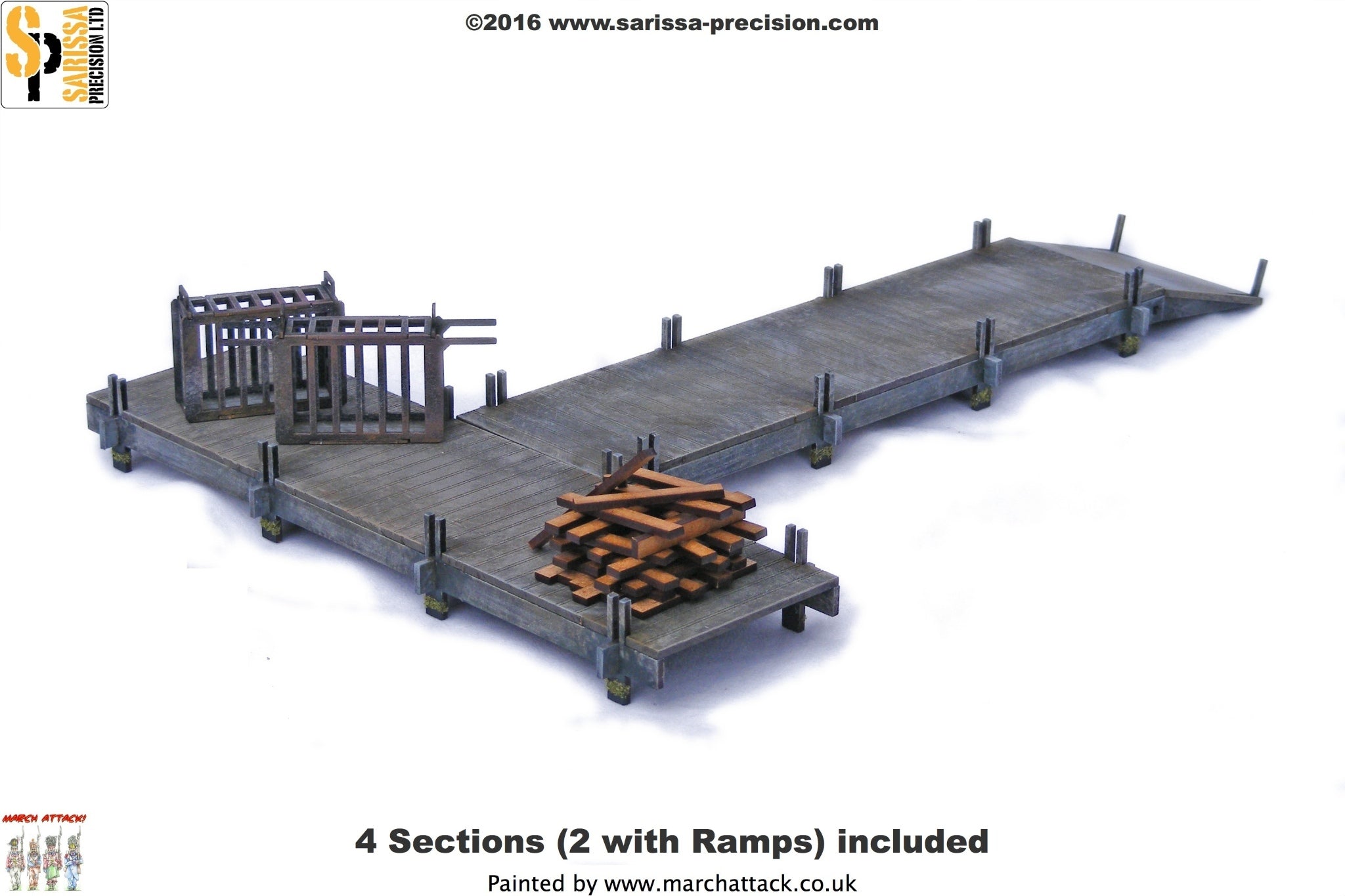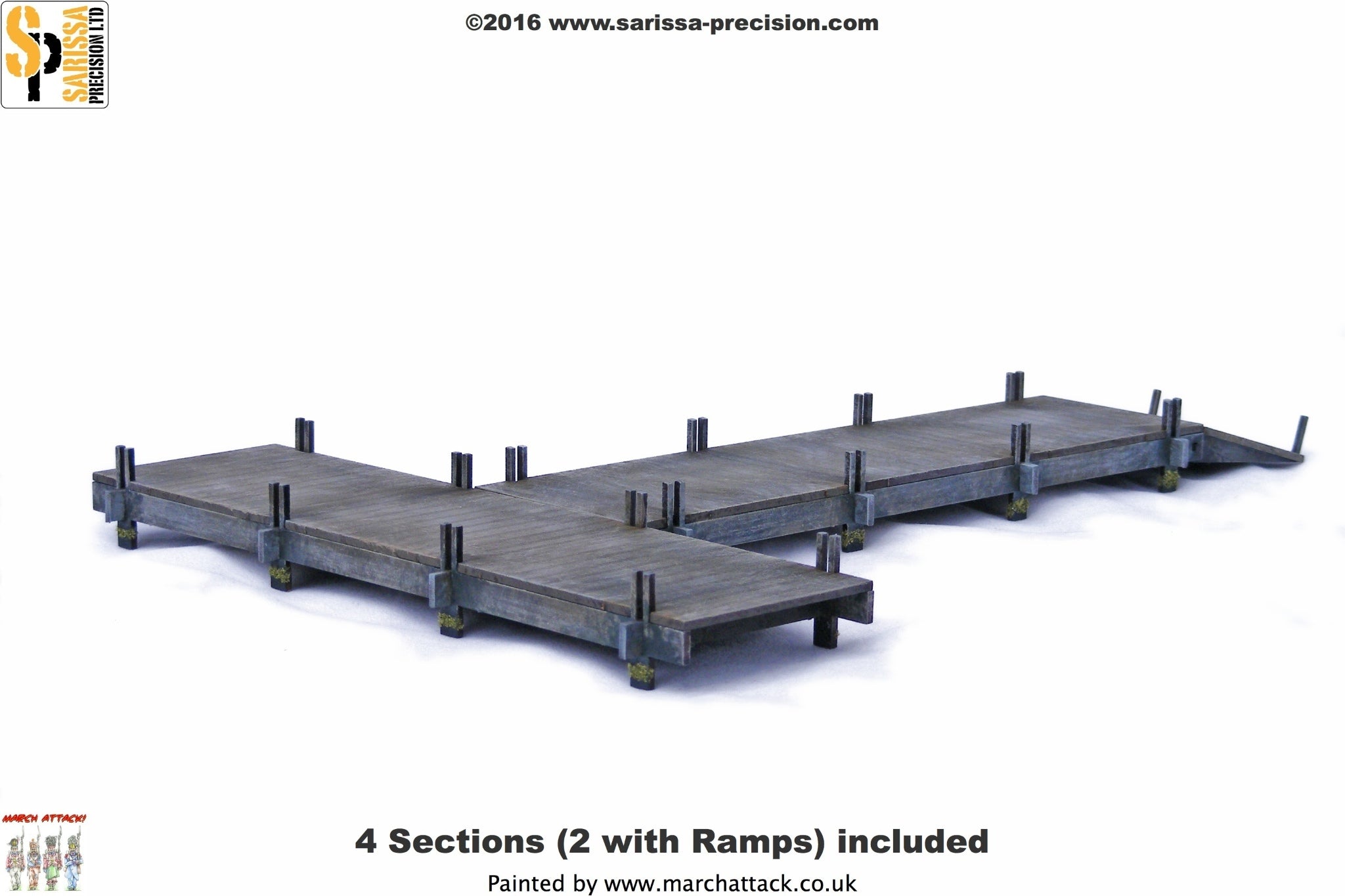 | Photos show one jetty and one jetty with a ramp; you will receive two of each. Supplied unassembled and unpainted in kit form with full instructions. Miniatures and accessories shown are for scale purposes only and are not included. | |||||