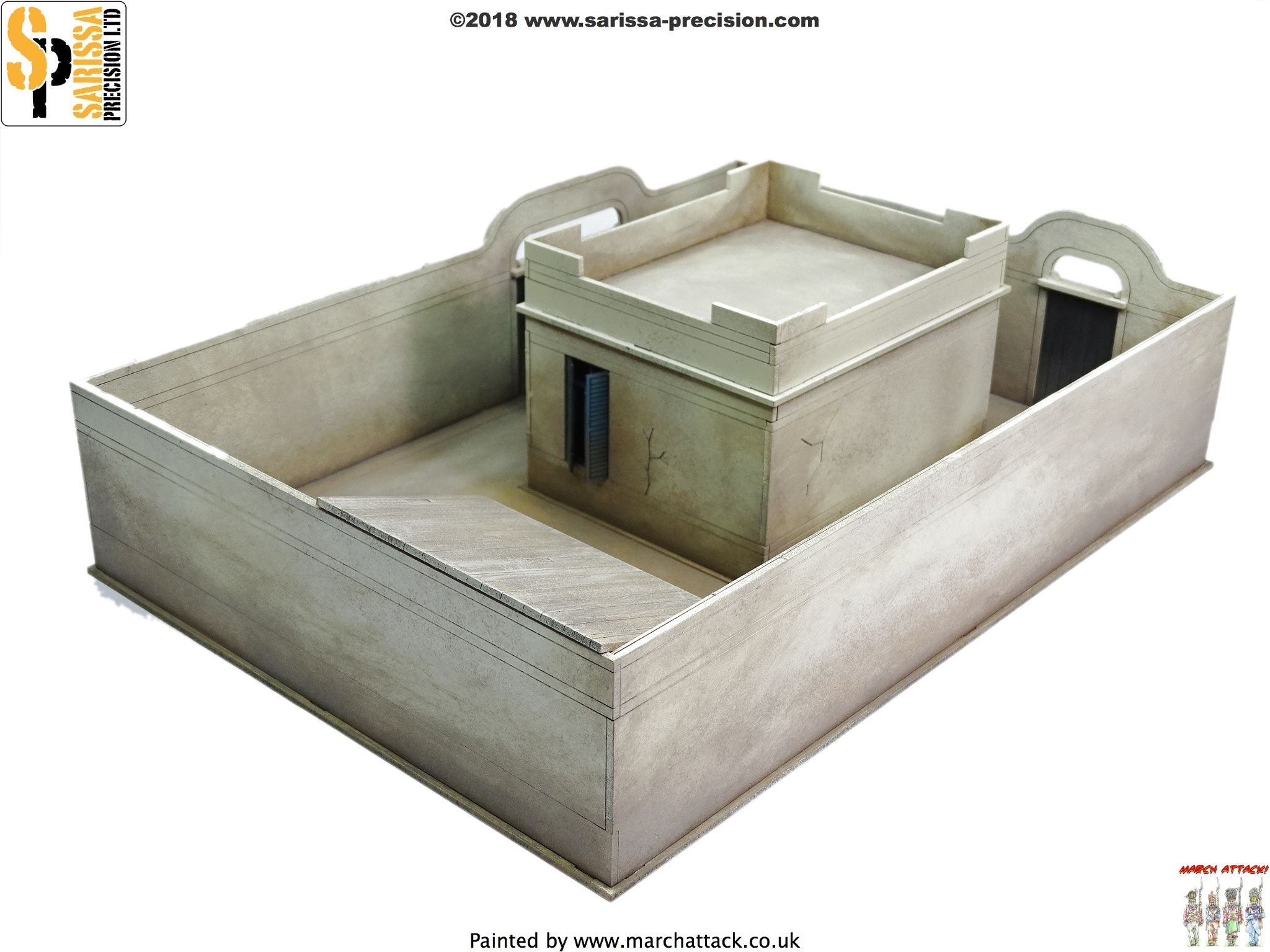 | This kit includes a compound composed of a house and a shed surrounded by a wall. The house and shed fit into the compound but can be pulled out and used on their own. Supplied unassembled and unpainted in kit form with full instructions. Any models or accessories shown for scale purposes are not included. | |||||