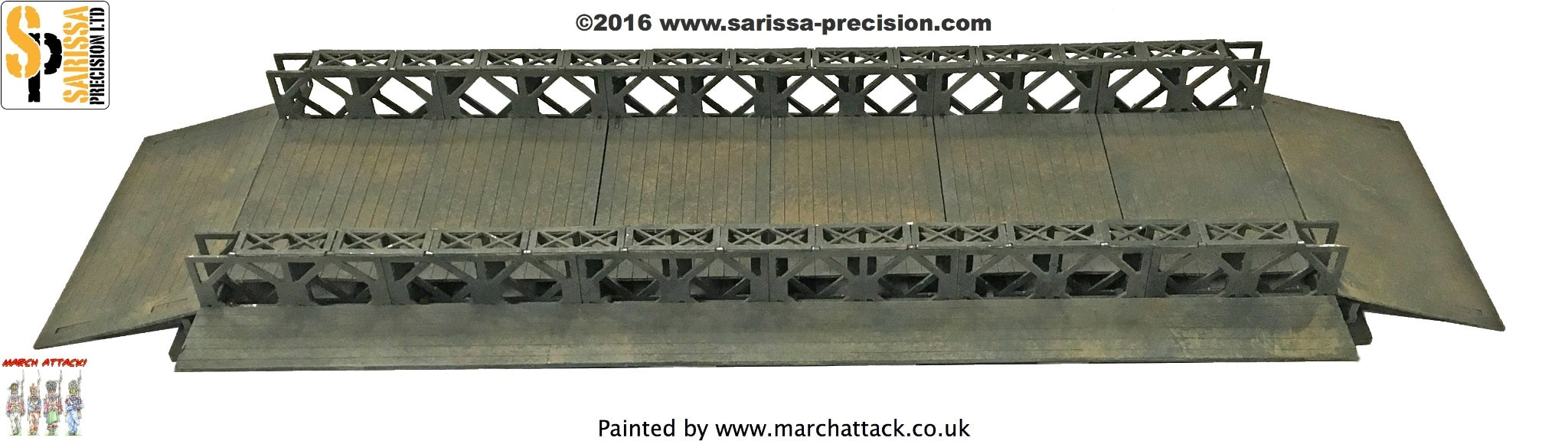 Designed by British engineer Donald Bailey, the Bailey Bridge is a portable, pre-fabricated truss bridge used extensively by allied forces during WWII. The Bridge has a modular construction and can be built and modified to suit different span gaps. The collapsible boats can be left off and the bridge used simply to span a gap without support. Supplied unassembled and unpainted in kit form with full instructions. Any models or accessories shown for scale purposes are not included. |