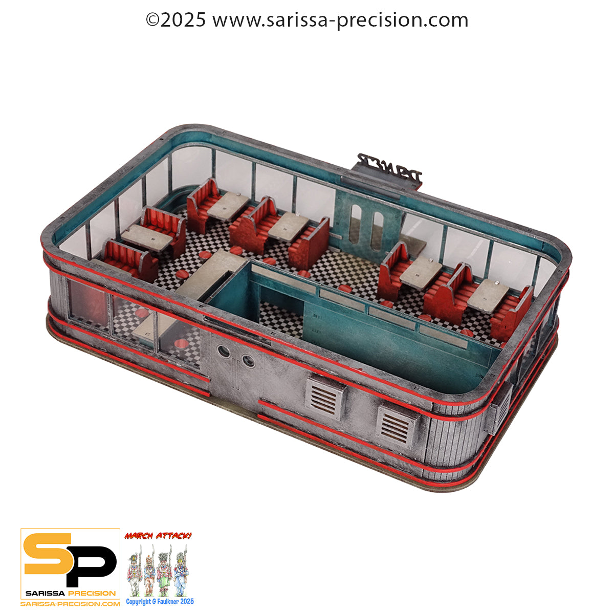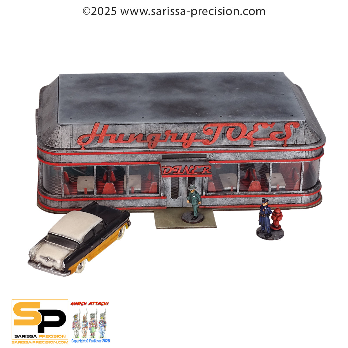 A classic slice of 1950s Americana, Joe’s Diner is a perfect focal point for tabletop action. Its etched detailing captures the look of the roadside diners that defined an era — ideal for street fights, ambushes, or narrative missions in small-town settings. Perfect for post-apocalyptic, modern and Cold War tabletop games. Supplied unassembled and unpainted in kit form with full instructions. Any models or accessories shown are for scale purposes only and are not included. |