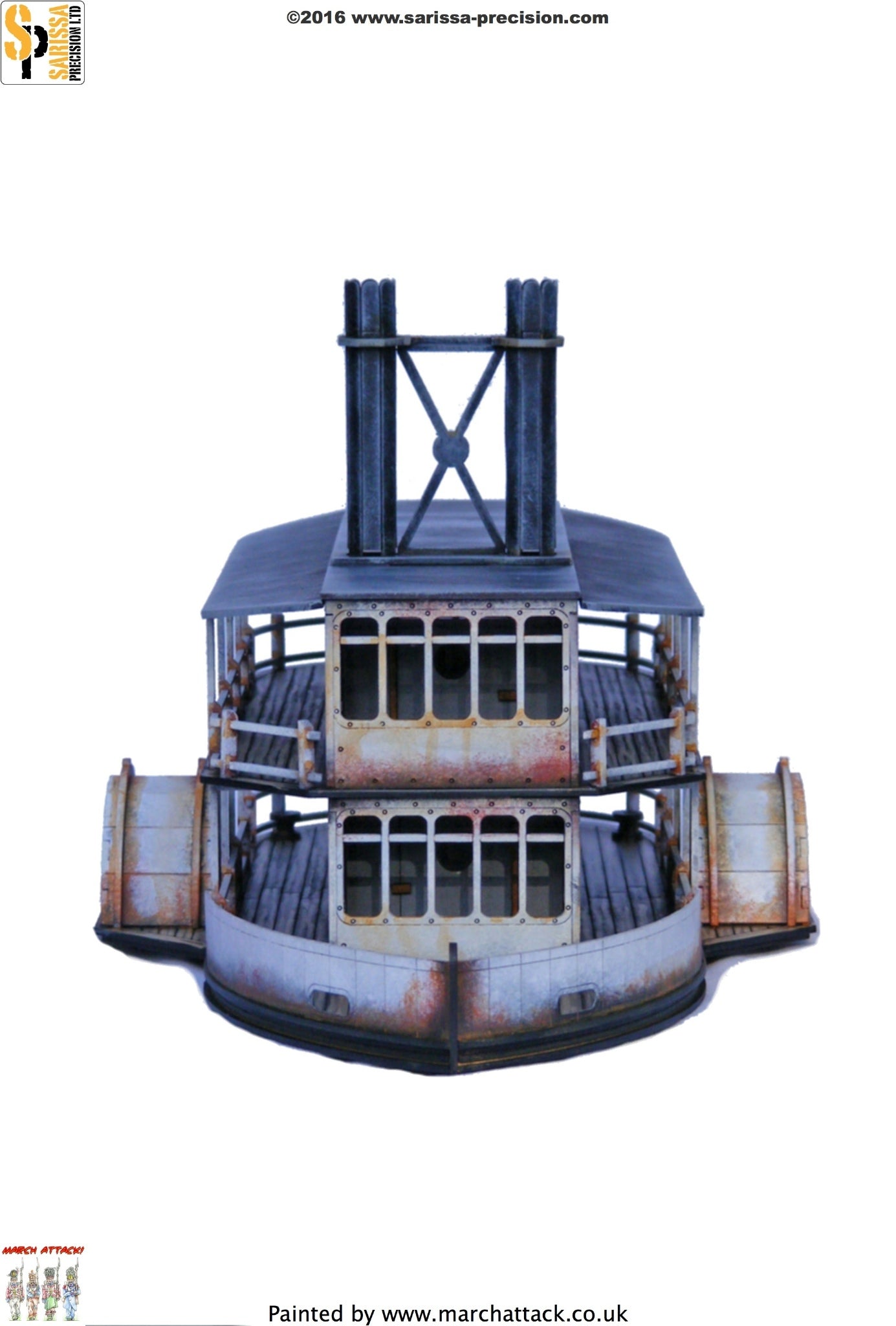 Paddle Steamers such as these played a vital part in transporting passengers, goods and supplies via colonial and American rivers. This versatile example would make a superb objective or feature on wargaming tables and dioramas with a colonial, Wild West or American Civil War setting.