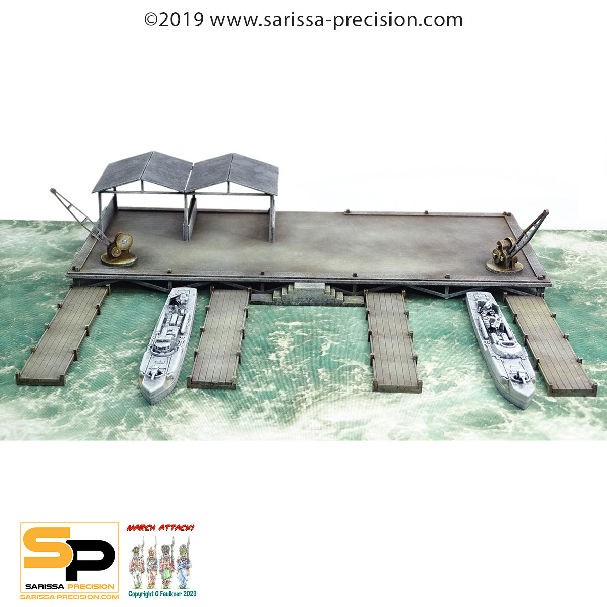 This kit comes with 2 cranes, 4 jetty's, set of steps and a warehouse, all in a scale of 1:300th for ship battles such as Cruel Seas