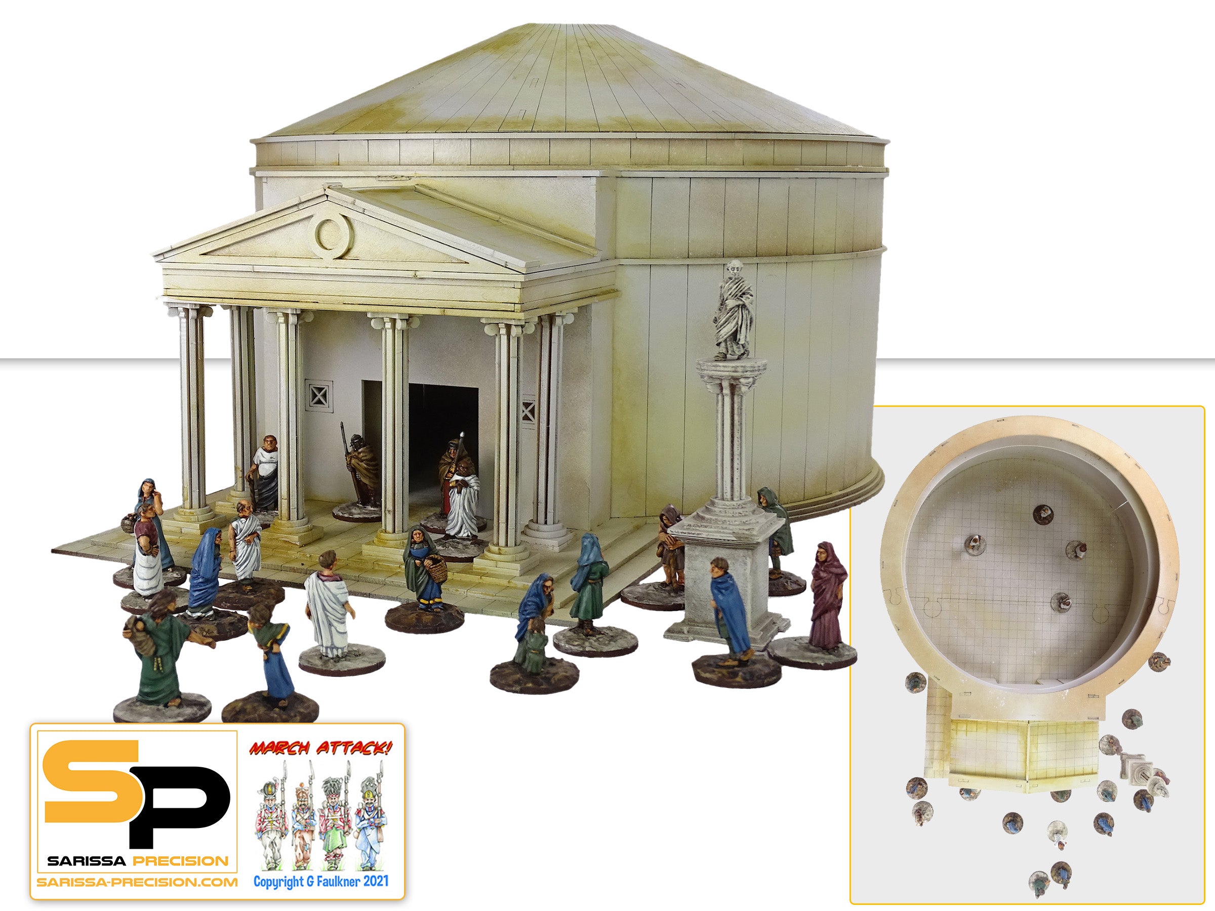The Pantheon's large circular domed cella, with a conventional temple portico front, was unique in Roman architecture and weighs in at a massive four & half thousand tonnes!. A style that has been copied many times by later architects and now you can add one to your Roman wargaming table with this detailed MDF kit!
