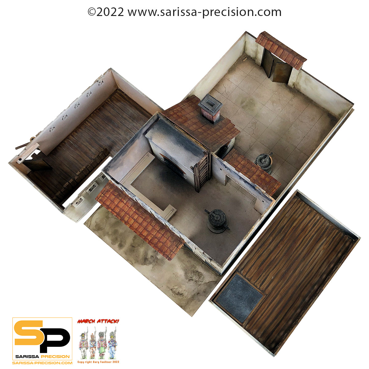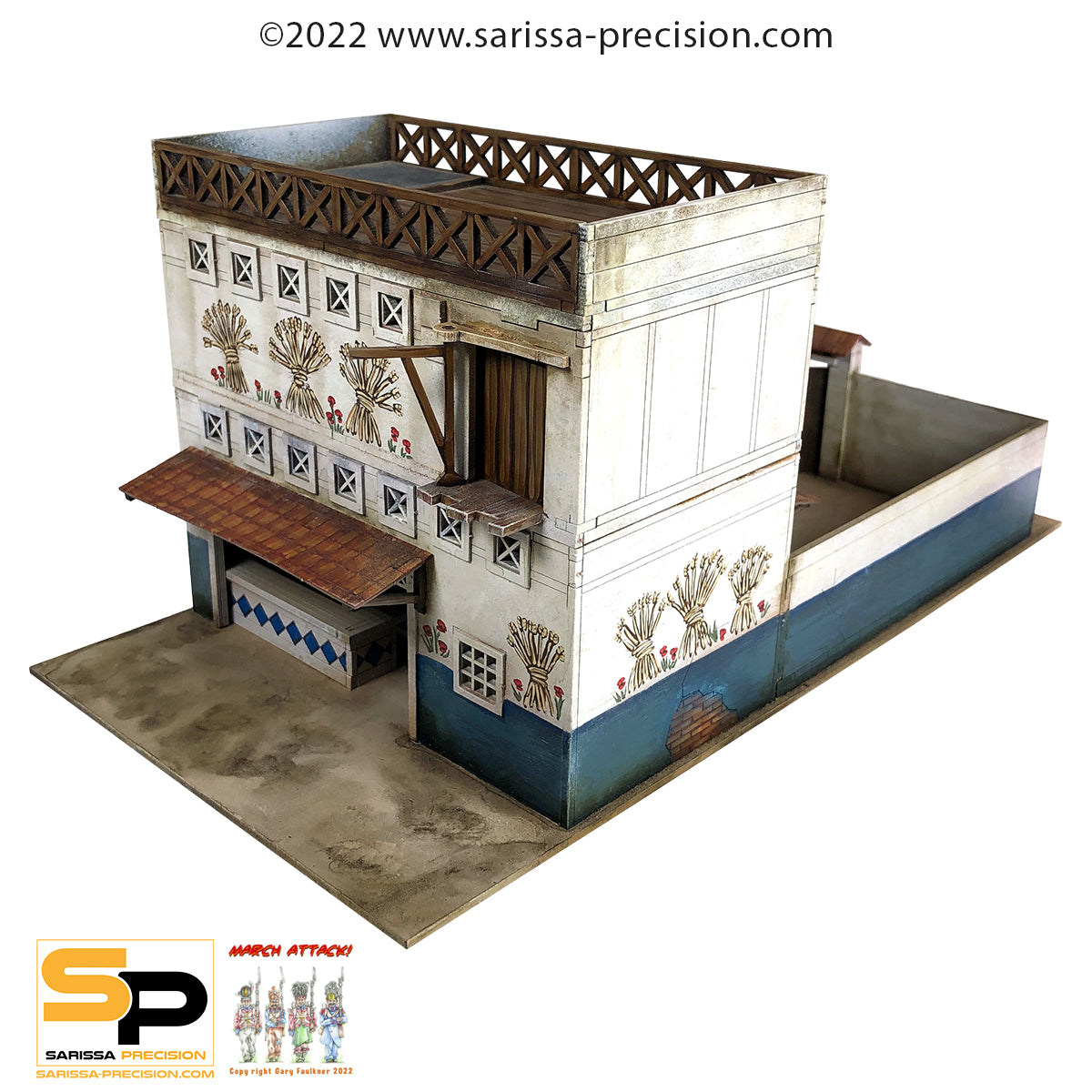 This Bakery kit has separate floors to allow your skirmish games to be fought on the rooftops. It even boasts a recessed flat roof providing an excellent place to roll your dice without fear of knocking over or disturbing any miniatures at ground level.