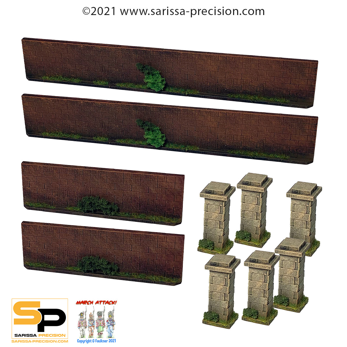 This set of 8 straight 30mm high brick walls contains 4x 100mm long and 4x 200mm long, plus 12 pillars to join the walls together.