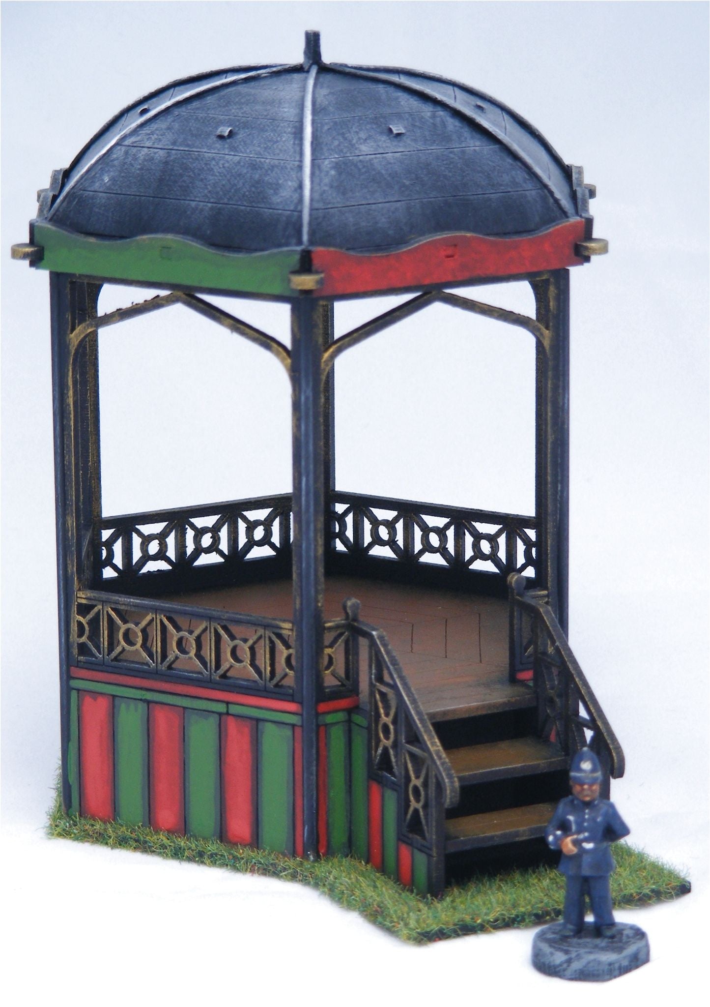 Created in Great Britain during the Victorian era, bandstands were considered a requirement for all parks throughout the Empire by the end of the 19th century. Our MDF and greyboard example would make an excellent addition to any steampunk or colonial wargaming table or diorama.