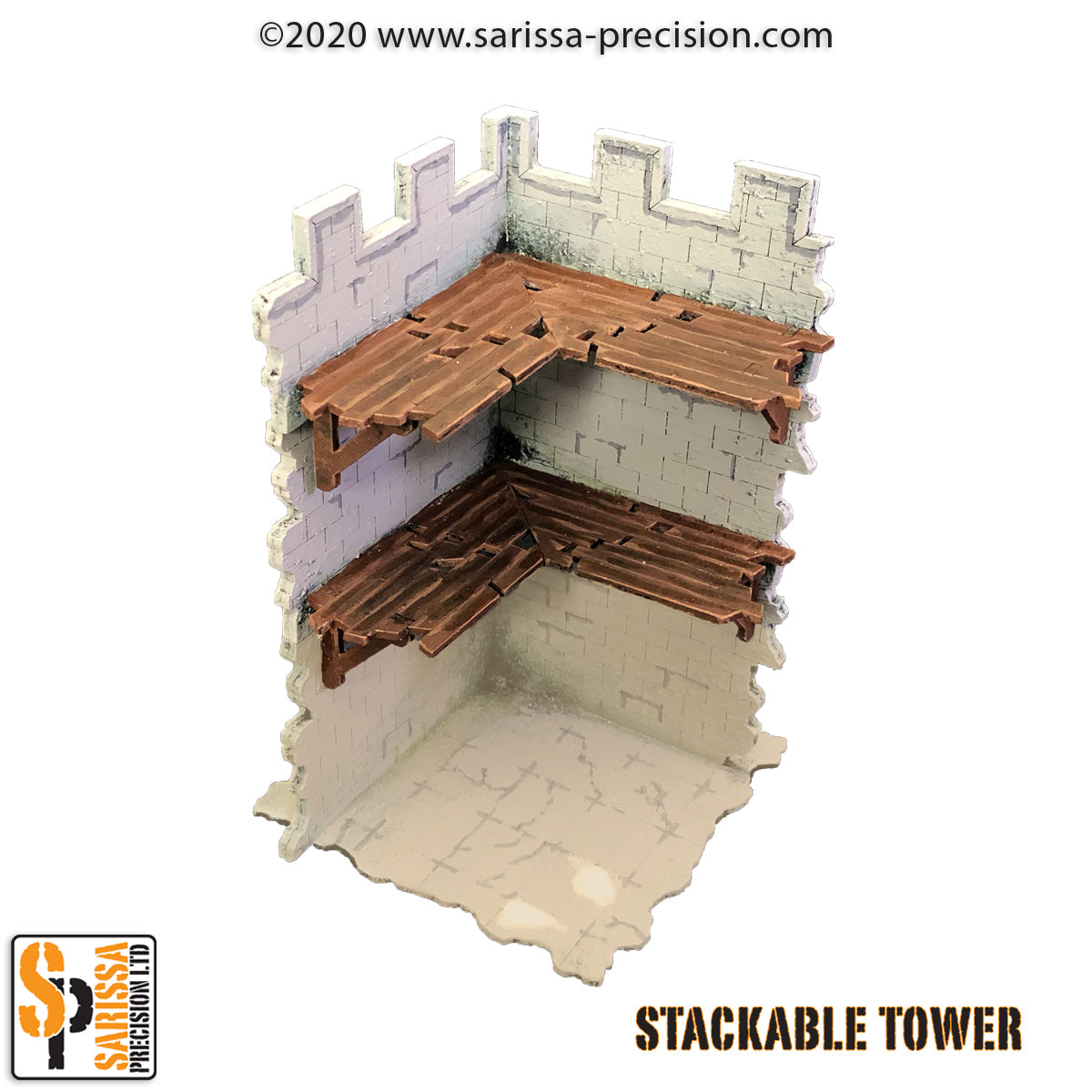 Stackable level 1 corner wall section with walkway (1), stackable corner wall section with crenelations (1)