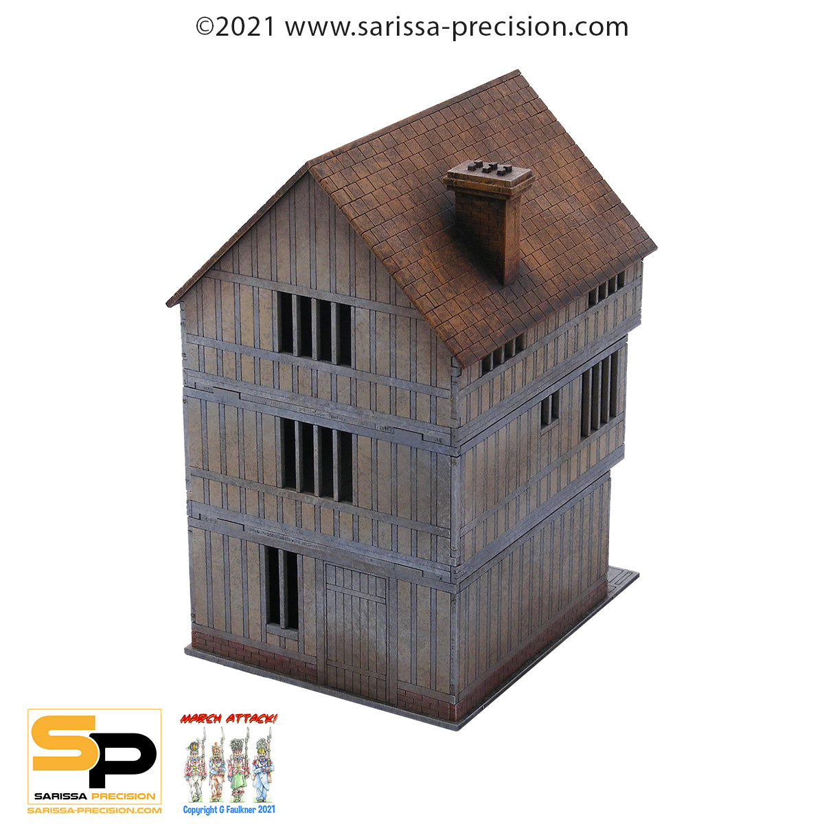 Timber framed townhouses such as these have been a common sight in European towns and cities since the 13th century. They are still in evidence today, making this versatile kit suitable for wargames with settings ranging from the ECW through to WWII. It is also ideal for fantasy RPGs with an urban setting. Supplied unassembled and unpainted in kit form with full instructions. Any models or accessories shown are for scale purposes only and are not included. |